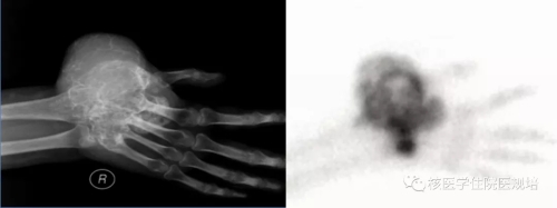 病史及检查目的: 患者63岁女性,4月余前无明显诱因出现持续性胸背部疼痛,沿肋间放射至胸部,左侧重,翻身及行走后加重,查体T4棘突压痛及叩痛(+)。行胸椎CT平扫+三维重建提示T4椎体变扁,后缘可见软组织密度影突向髓腔内,硬膜囊受压,考虑T4椎体病理性骨折可能。实验室检查:尿本周蛋白阴性;尿KAPPA轻链及LAMBDA轻链阴性;肿瘤标志物检测均为阴性。 为明确T4椎体病变性质、寻找骨转移原发灶行PET/CT检查(图2)。 图1.胸椎CT(骨窗) 图2. PET/CT图像 检查所见: T4椎体及附件区域见条状高度放射性浓聚(SUVmax:8.1),CT于相应区域可见溶骨性骨质破坏及软组织肿物影,向后累及附件并突入椎管内,椎体前缘骨皮质尚完整。左腋窝可见一FDG摄取增高淋巴结显影,考虑淋巴组织回流所致。扫描范围其余部位未见明显异常。 检查意见: T4椎体及附件骨质破坏呈葡萄糖代谢明显增高考虑恶性肿瘤可能,需鉴别原发灶不明的转移瘤、浆细胞瘤、骨巨细胞瘤、骨的嗜酸性肉芽肿及不典型淋巴瘤等,建议组织病理学检查。 手术及病理: 行胸椎椎管减压、椎弓根钉内固定术、病灶清除、椎体成形术,积水潭医院病理会诊:(胸4椎体)富含多核巨细胞病变,组织形态首先考虑骨巨细胞瘤。免疫组化:CK(-),Desmin(-),Ki67(10%-15%+),Vimentin(+),ActinSM(-),PGM-1(多核巨细胞+),KP-1(多核巨细胞+)。 病例相关知识: 骨巨细胞瘤(giant cell tumor of bone,GCT)为一种临床较为常见的骨原发性肿瘤,大部分为良性肿瘤,部分生长活跃,极少数一开始就是恶性。GCT具有丰富的血管组织并含有单核基质细胞和很多破骨细胞样的多核巨细胞,其中基质细胞决定肿瘤的性质。Jaffe等[1]首次定义GCT并根据基质细胞的异型性及有丝分裂活动进行病理分级,一般认为I级偏良性,Ⅲ级为恶性,介于两者之间的为Ⅱ级。目前WHO第四版骨与软组织肿瘤已将GCT定义为交界性肿瘤。与西方国家相比,国内GCT的发病率较高,约占所有原发骨肿瘤的20%[2]。女性发病率高于男性,多发生于青壮年,发病年龄多在20-40 岁之间,50岁以上的GCT约占9%-13%,青年人和儿童少见[3]。GCT多发生于骨骺融合后成熟的骨端[4],侵犯长骨多见,*常见于股骨下端、胫骨上端,约占50%以上,发生于非长管状骨如脊柱、骨盆、手骨、颌骨、颅骨等的GCT约占20%,但近年来也有报道GCT在脊柱的发病率增加。该病*常见的症状为肿瘤部位的疼痛与肿胀,且疼痛有活动后加重、休息后缓解的特点,手术是治疗GCT的主要方法,目前亦有一些RankL拮抗剂用于术前药物治疗。 GCT的影像表现具有一定特异性,X线平片表现为骨端偏心性、囊性、膨胀性、溶骨性骨质破坏, 无明显硬化缘,骨包壳完整或部分缺如,部分肿瘤内可见骨性分隔,呈“皂泡样”改变(图3)。CT较X线具有较高的分辨率,能更加细致入微地观察骨质破坏情况,可观察到骨质破坏区内残留的骨嵴,与X线平片上“皂泡样”改变相对应,还可以能清晰地显示破坏区内部结构及软组织肿块及周边残留的骨壳。MRI检查能够清晰显示骨巨细胞瘤的大小、位置及形态,且对肿瘤附近的水肿状况进行清晰显示,在诊断病变范围上的价值较X线与CT检查更高。在MRI检查中,肿瘤的实质部分多呈T1WI与T2WI等信号,其内常可见多发混杂信号影,提示肿瘤内部常伴有坏死、囊变和出血。 图3. 骨巨细胞瘤的皂泡样改变(左:X线片,右:99mTc-MDP骨显像)(北京大学人民医院提供) 尽管骨肿瘤的*终诊断的确立需要临床、影像、病理三结合,即“CRP诊断”,但典型的影像表现对早期临床诊疗决策的建立十分重要。18F-FDG PET/CT全身大视野成像有助于发现肿瘤累及区域,通过发现多发病灶,首先可帮助检出转移瘤或血液系统肿瘤。然而,本病例PET/CT所见为脊柱单发病变,其鉴别诊断面临更多的挑战。由于病灶呈溶骨性骨质破坏并软组织肿物形成,椎体出现病理性骨折且软组织肿物压迫硬膜囊,同时肿瘤呈FDG高摄取,鉴于患者年龄偏大,应首先怀疑恶性病变。患者无肿瘤标志物升高且PET/CT无原发肿瘤病灶显示,不支持上皮源性肿瘤脊柱转移,但从发病机率应考虑有无原发灶隐匿的可能性;病变椎体前缘保留较完整,提示肿瘤侵袭性不强,不符合侵袭性淋巴瘤或一些高度恶性肉瘤的常见表现;单发浆细胞瘤多为溶骨性且可呈膨胀性改变,破坏区可见残留的骨壳和骨嵴,但一般FDG摄取程度相对较低;骨的嗜酸性肉芽肿属于朗格汉斯组织细胞增生症虽可累及脊柱并出现病理性骨折,其FDG摄取程度亦较高,但该病多见于年轻人群。回顾性分析该患者年龄虽然不属GCT好发人群,但亦可发病,而较高的FDG摄取和较温和的骨质破坏可符合GCT表现,然而由于椎体压缩性骨折使得CT对肿瘤形态和内部结构改变的观察不满意。若能获得典型的GCT CT表现,GCT诊断应该首先考虑(图4)。 图4.典型脊柱骨巨细胞瘤的PET/CT及MRI(北京大学人民医院提供) 对于原发性骨肿瘤,18F-FDG PET/CT的摄取与肿瘤成分密切相关,富含巨细胞的肿瘤(骨巨细胞瘤、未分化肉瘤、朗格汉斯组织细胞增生症等)多可见较高FDG摄取,甚至高于常见的恶性骨原发性肿瘤(骨肉瘤、软骨肉瘤、尤文肉瘤等),而良性肿瘤或者细胞成分稀疏的恶性肿瘤FDG摄取程度较低。 小结: 本病例并非典型的骨巨细胞瘤,通过此病例提出这一临床可能遇到的情况,希望为规培的小伙伴们提供脊柱病变的鉴别诊断思路。同时强调对于骨肿瘤的诊断一定是临床、影像、病理的综合分析,对常见的骨原发肿瘤相